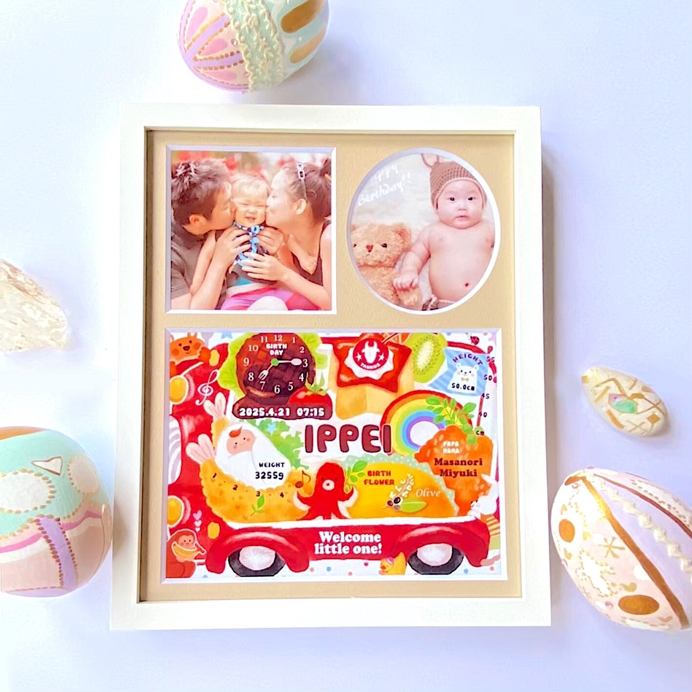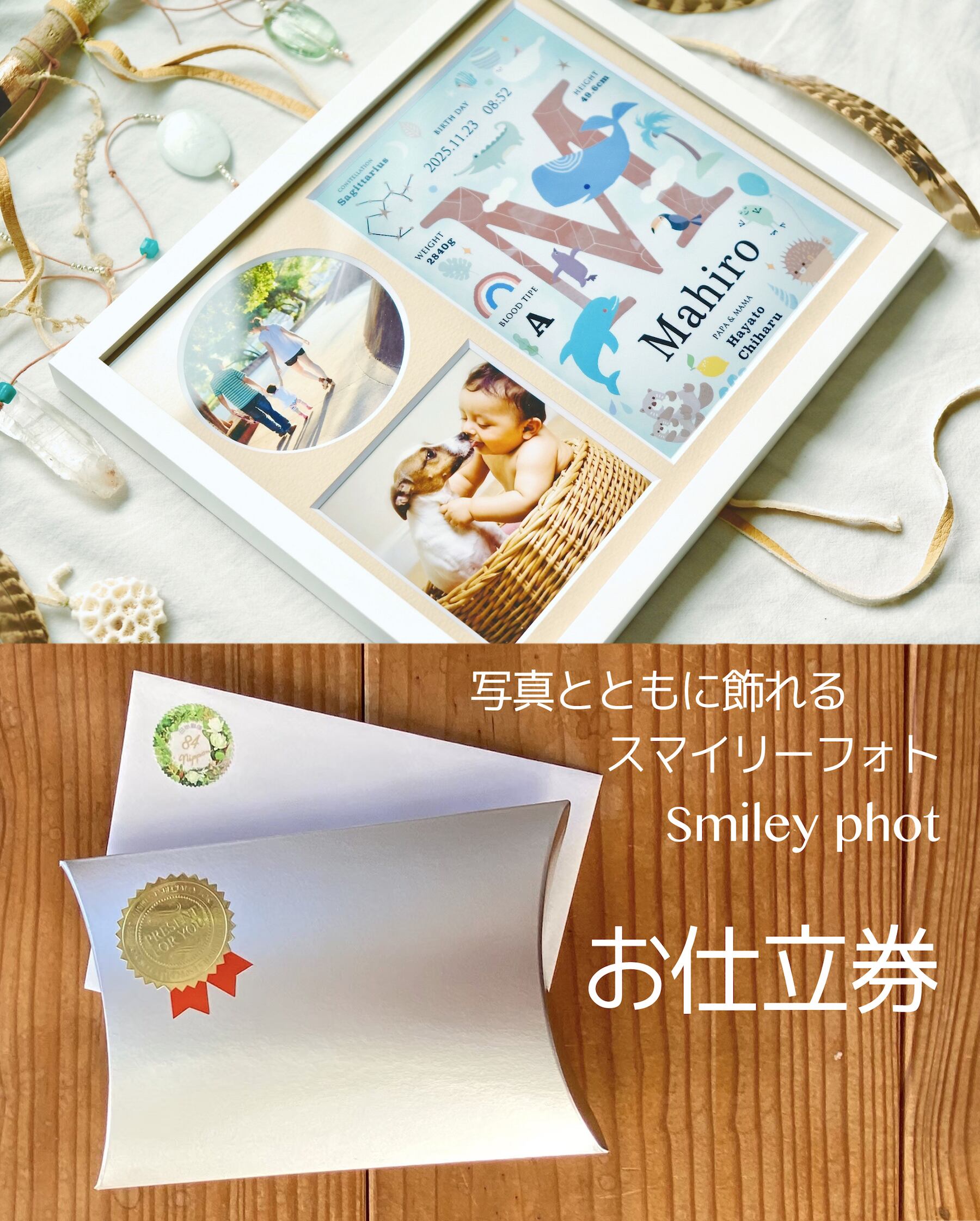 写真とベビーバースのイラストを一緒に飾れる『スマイリーフォト』お仕立券です。 お祝い、情報が分からない方や、サプライズギフトにもおすすめです!